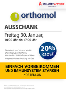 Probieren Sie Orthomol Immun und Orthomol Chondroplus direkt vor Ort und erfahren Sie, wie die hochwertigen Mikronährstoffkombinationen Ihr Wohlbefinden unterstützen können.